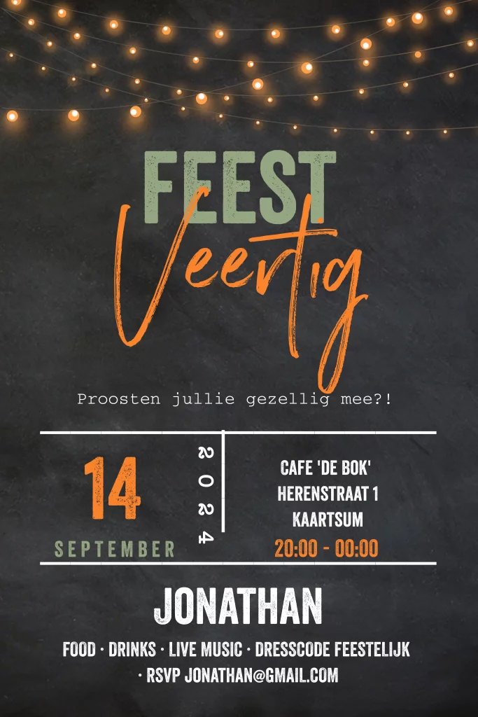 Verjaardagsuitnodiging krijtbord en lampjes 40 jaar