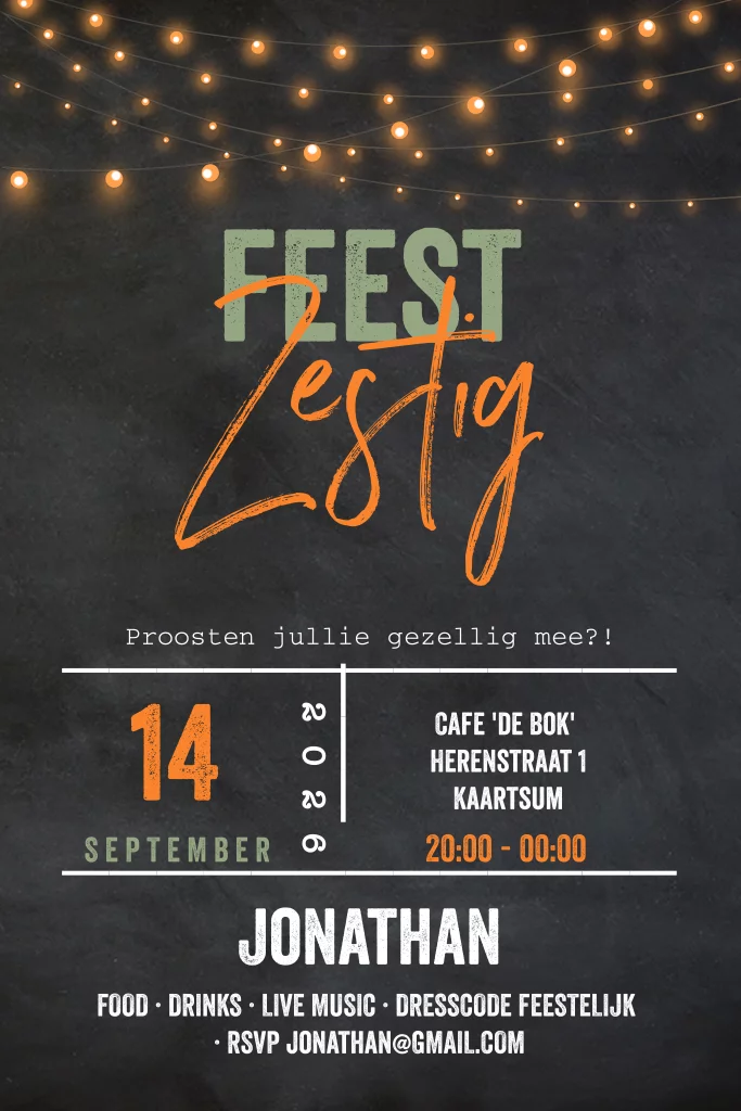 Verjaardagsuitnodiging krijtbord en lampjes 60 jaar