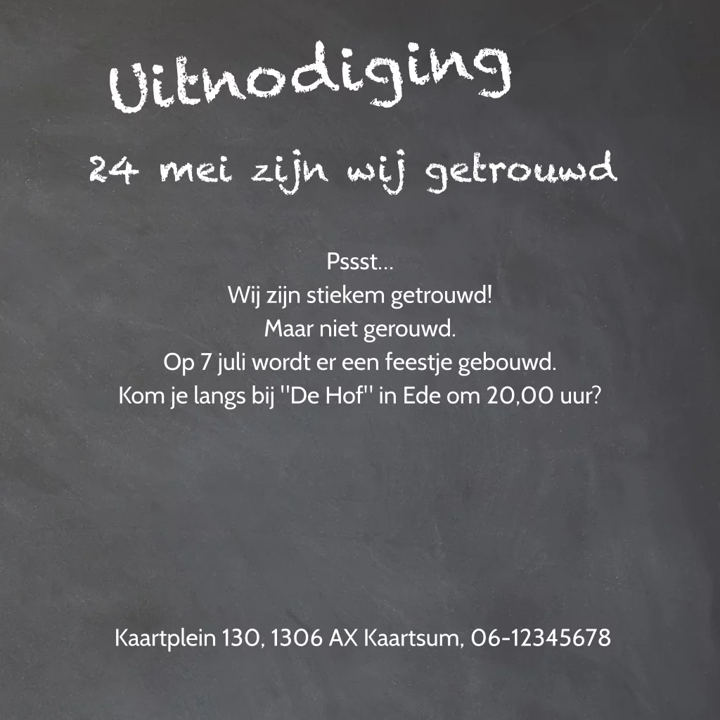 Wij zijn getrouwd trouwkaart bruin hout met foto en krijtbord. Met diverse trendy krijtversieringen. (2016)