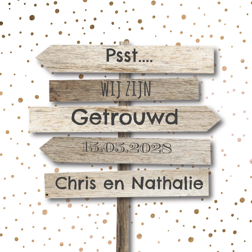 Wij zijn getrouwd uitnodiging met houten wegwijzer