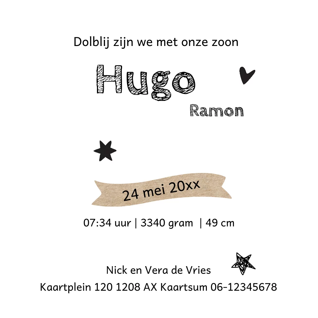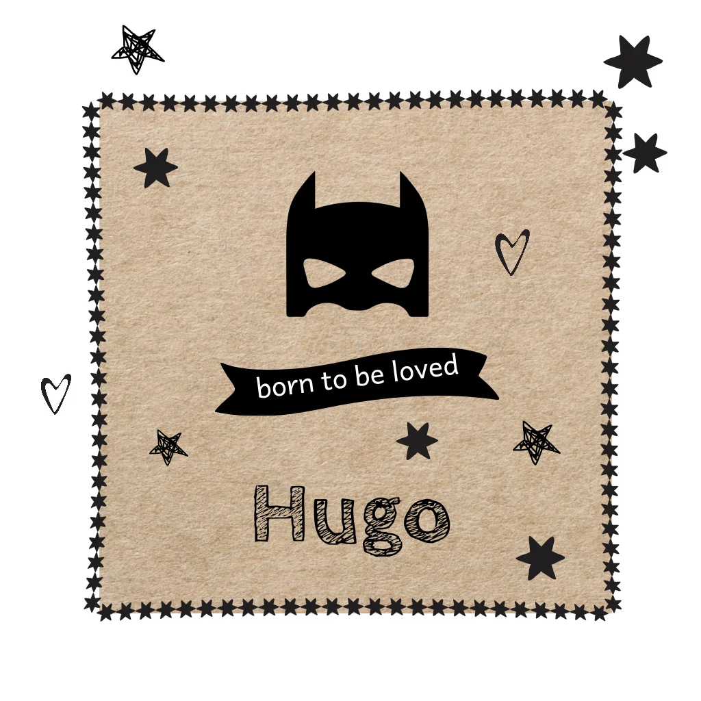 Stoer geboortekaartje voor een superheld jongen met sterren, karton en masker. (3418) In Batman superheld look thema.