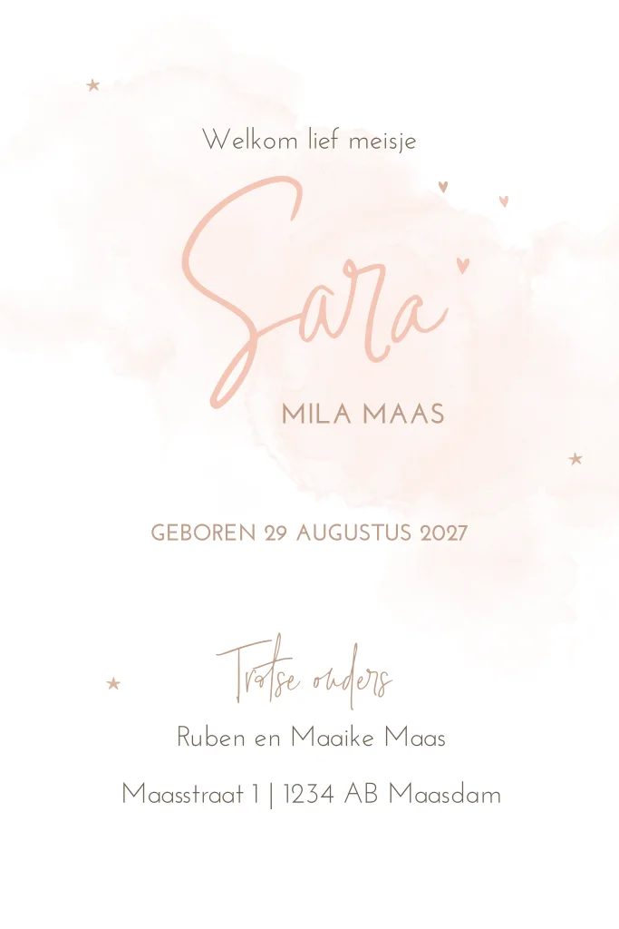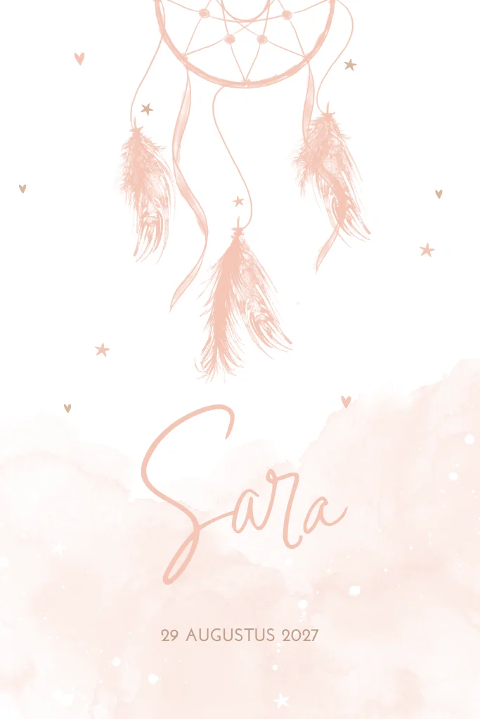 Geboortekaartje meisje bohemian stijl in roze aquarel met dromenvanger met veertjes (21265) Geboortekaartje Sara