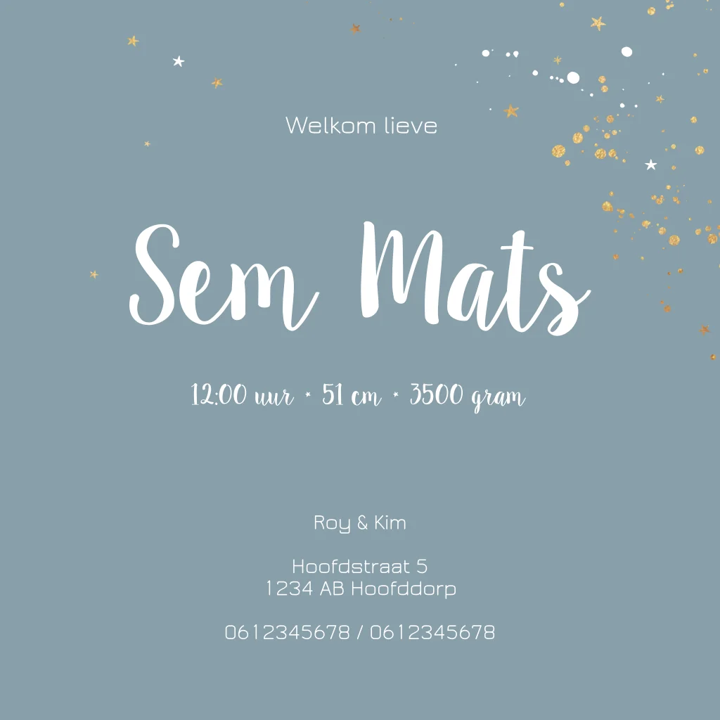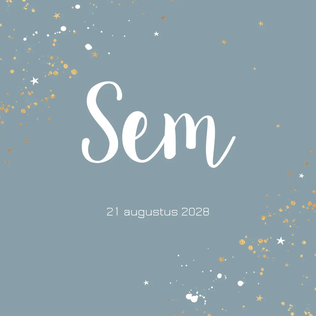 Hip geboortekaartje jongen Sem blauwe trendkleur en goudlook spetters
