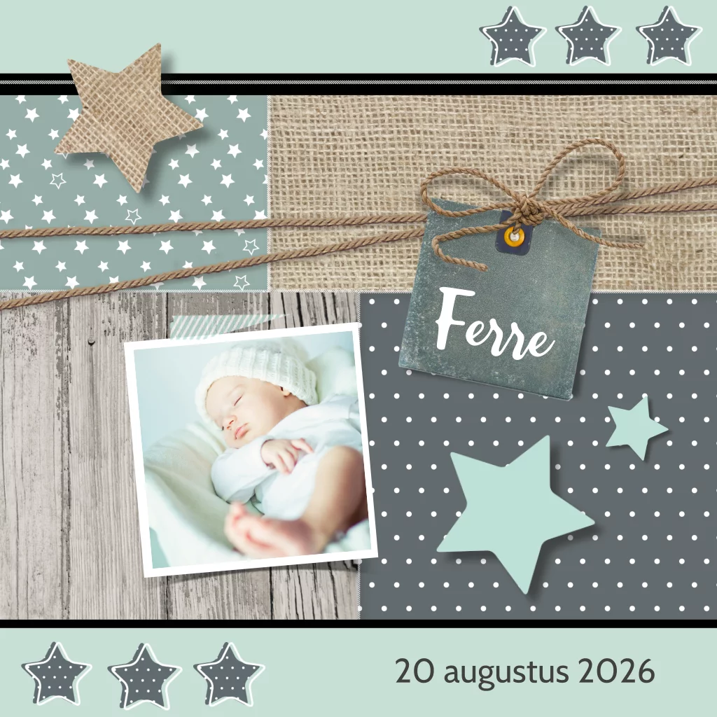 Geboortekaartje jongen met ruimte voor een eigen babyfoto. Op de achtergrond een patroon van onder andere jute, sterren, stippen en label en in groen grijs tinten. (21924)