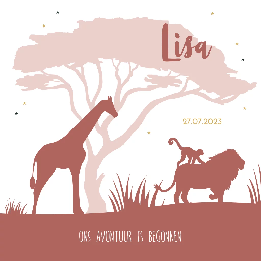 Jungle geboortekaartje meisje met giraffe en leeuw. Sterretjes in de lucht en een mooie boom. (21923)