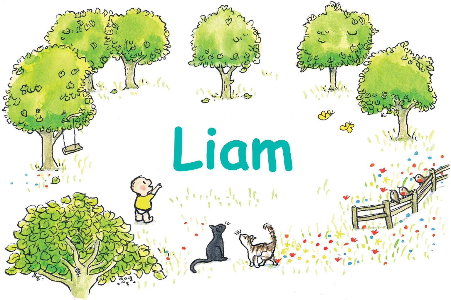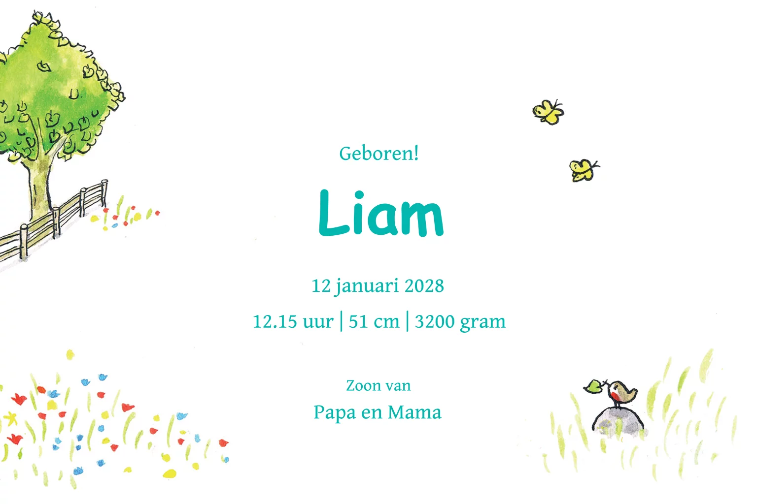Geboortekaartje jongen, bomen, vogeltjes en katjes in tuin