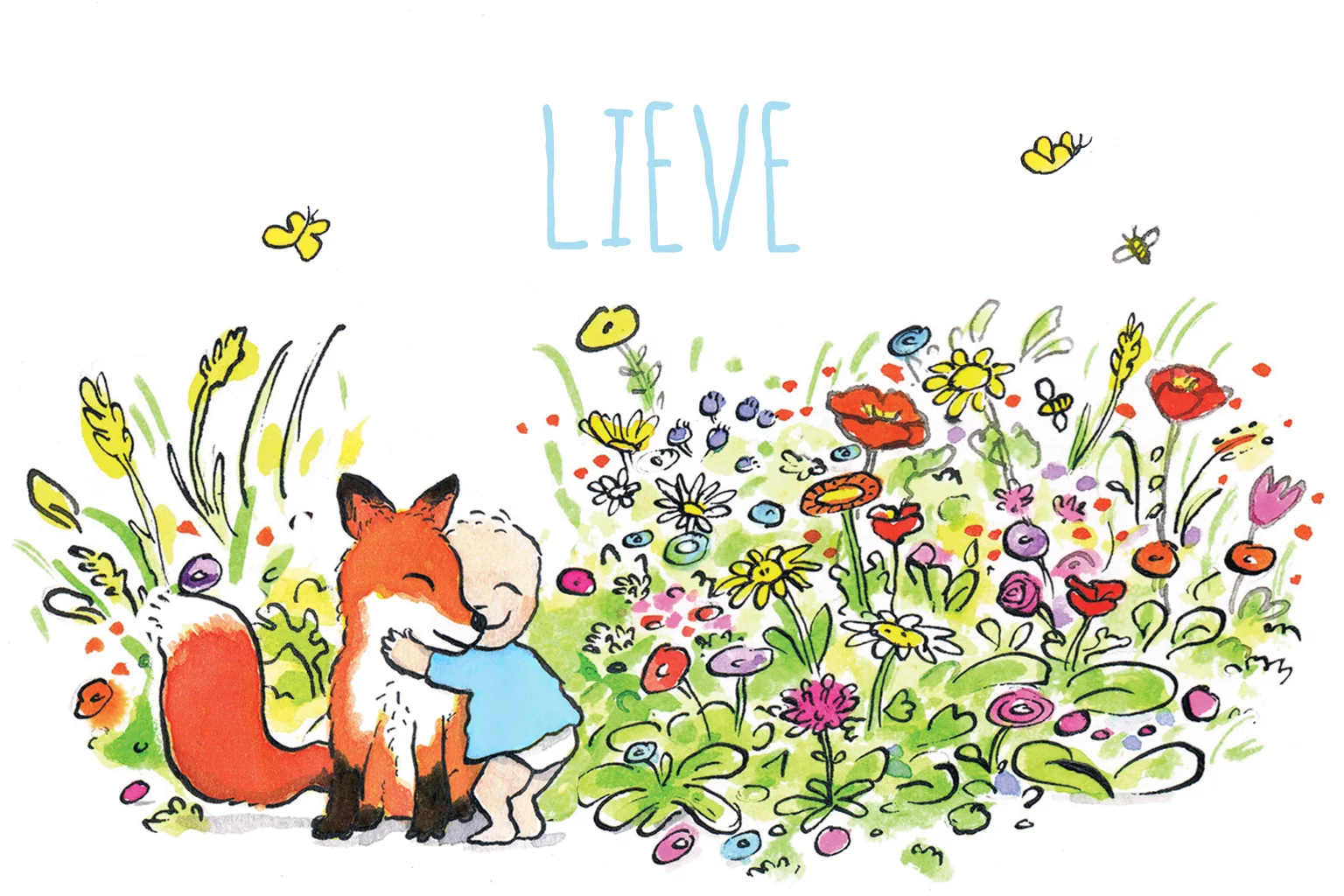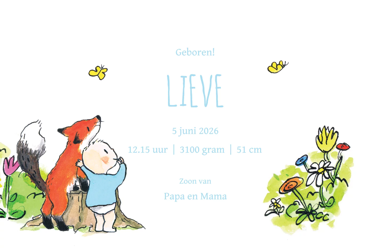 Getekend geboortekaartje voor jongen, met kindje en klein vosje in een veld met bloemen en vlinders. (21148)