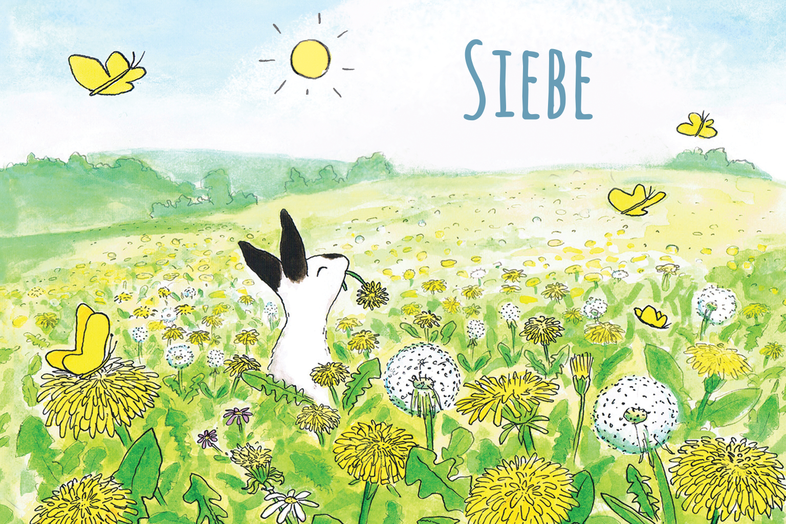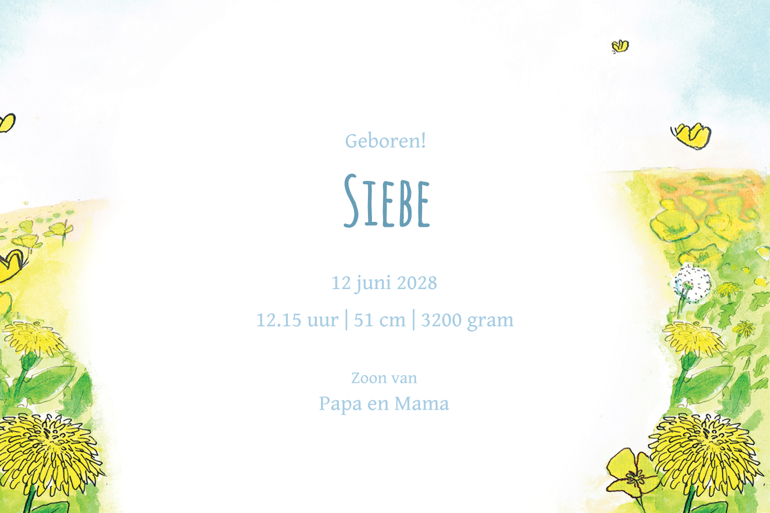 Geboortekaartje voor jongen. Konijntjes in zonnige wei vol gele paardebloemen en vlinders. Natuurlijk, speels en vrolijk. (21329)