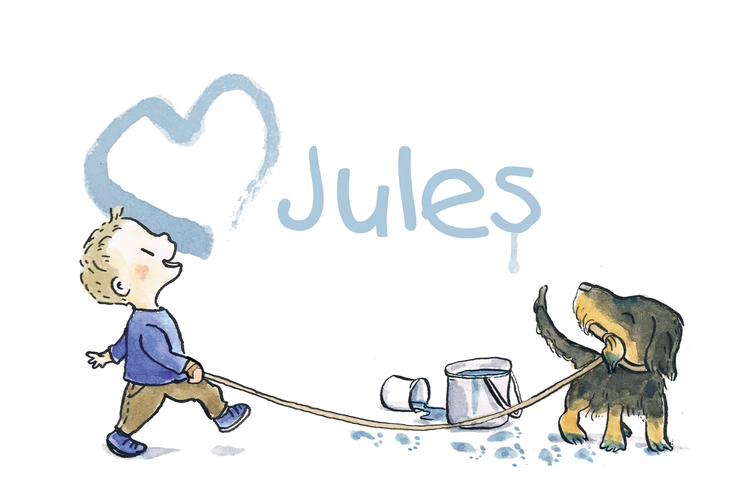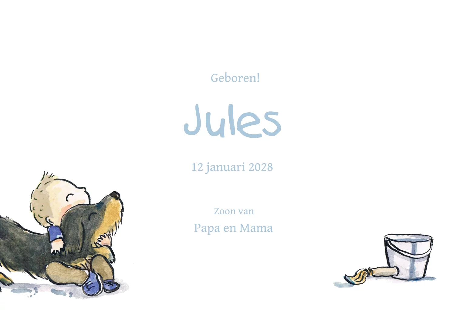 Jongens geboortekaartje met hond met teckel in zachte kleurtinten. Met de naam al graffiti op de muur.