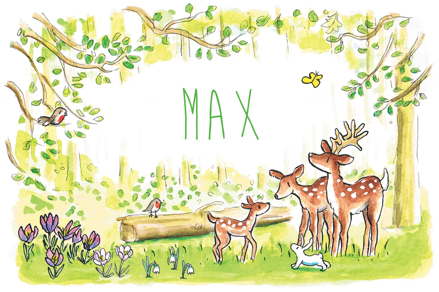 Met de hand getekend geboortekaartjes voor jongen met bosdieren. Met een familie hertjes, dieren en bloemen in het bos. (21011)