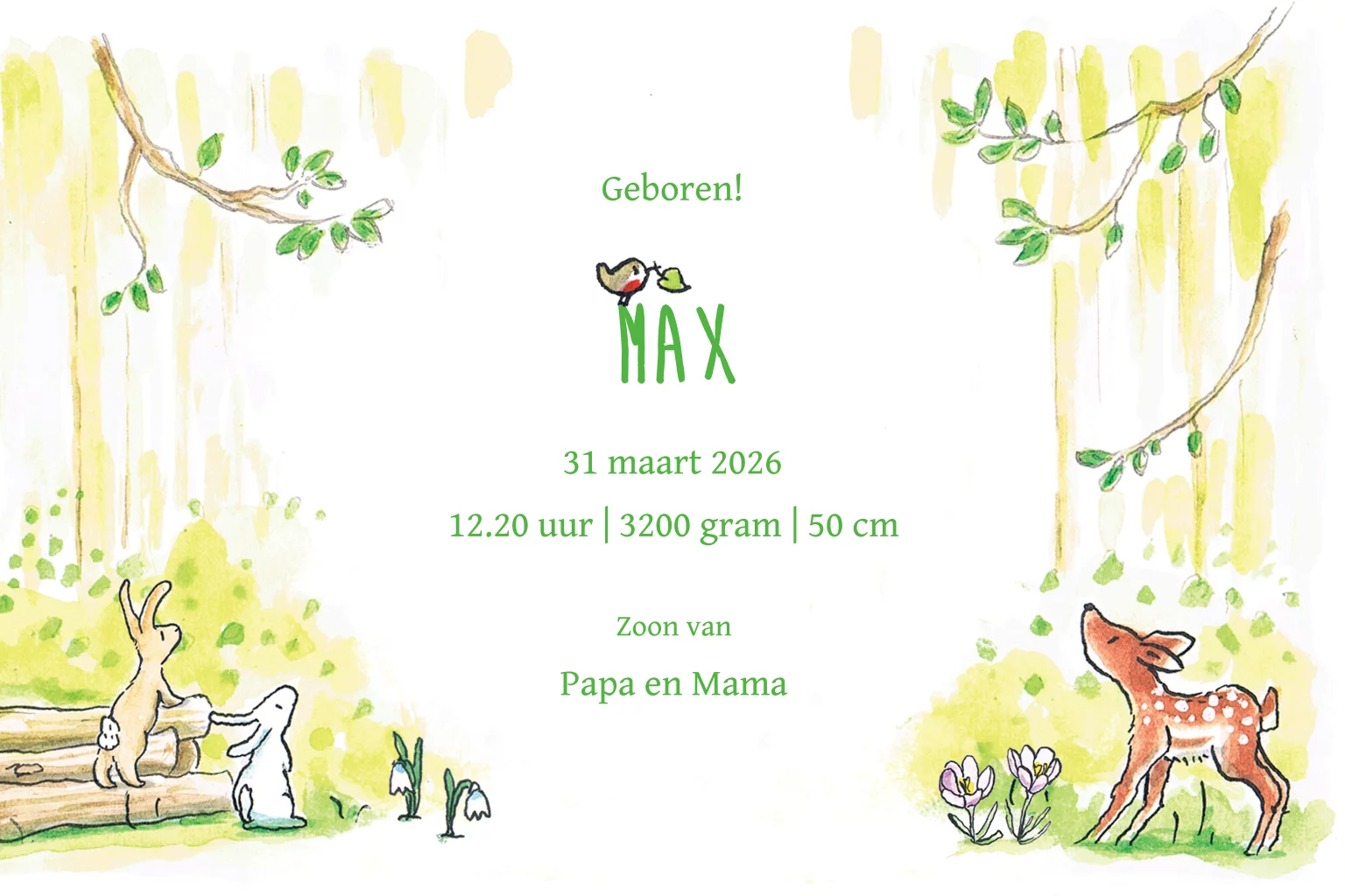 Geboortekaartje jongen met hertjes in een bos