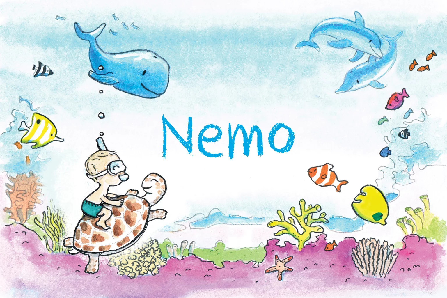 Getekend geboortekaartje voor jongen. Onderwater in de zee zwemt een jongen met een schildpad. Dolfijnen, walvis en koraal. (21351)