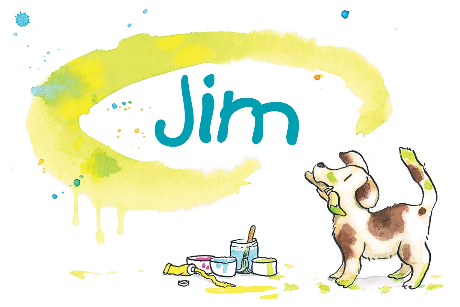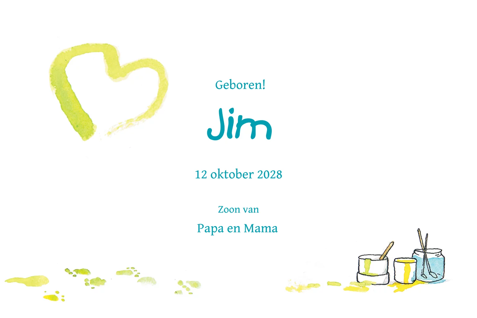Getekend geboortekaartje voor jongen. Lief puppy hondje met verf, creatief schilderen. (21316)