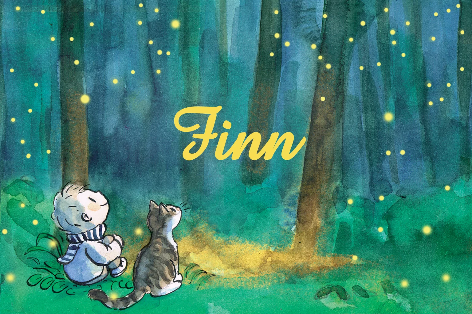 Getekend geboortekaartje Finn voor jongen. Jongen naast een pores / kat met vuurvliegjes in bos. Sprookjesachtig en mystiek. (21328)