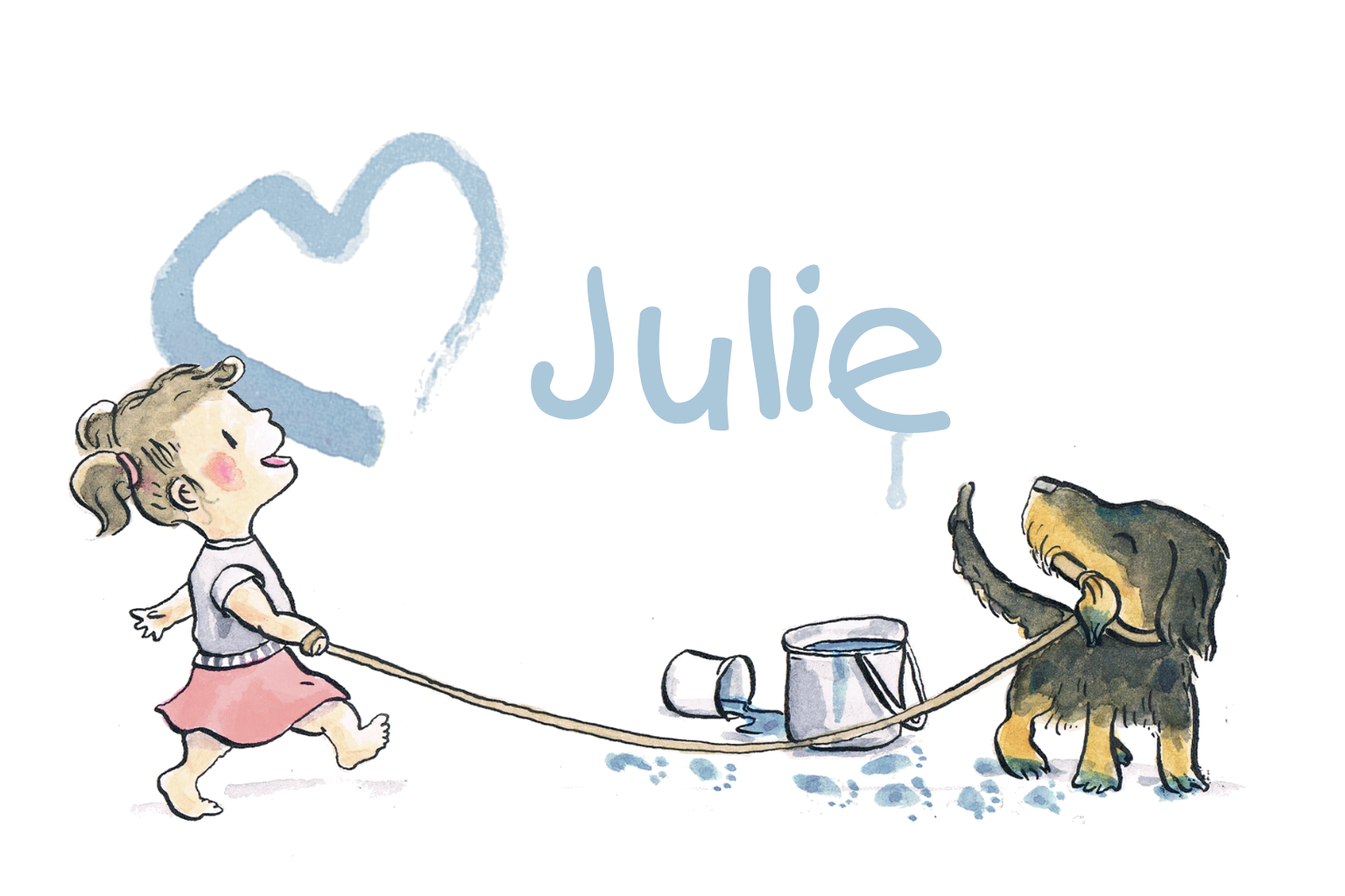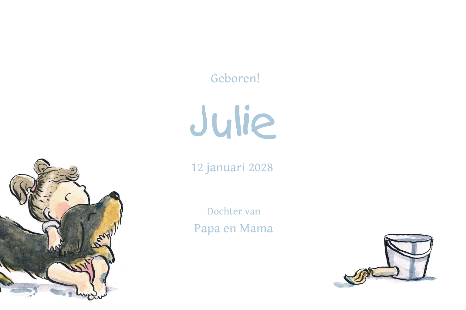 Getekend geboortekaartje voor meisje. Een teckel en een meisje knuffelen en schilderen een hartje met verf. (21346)
