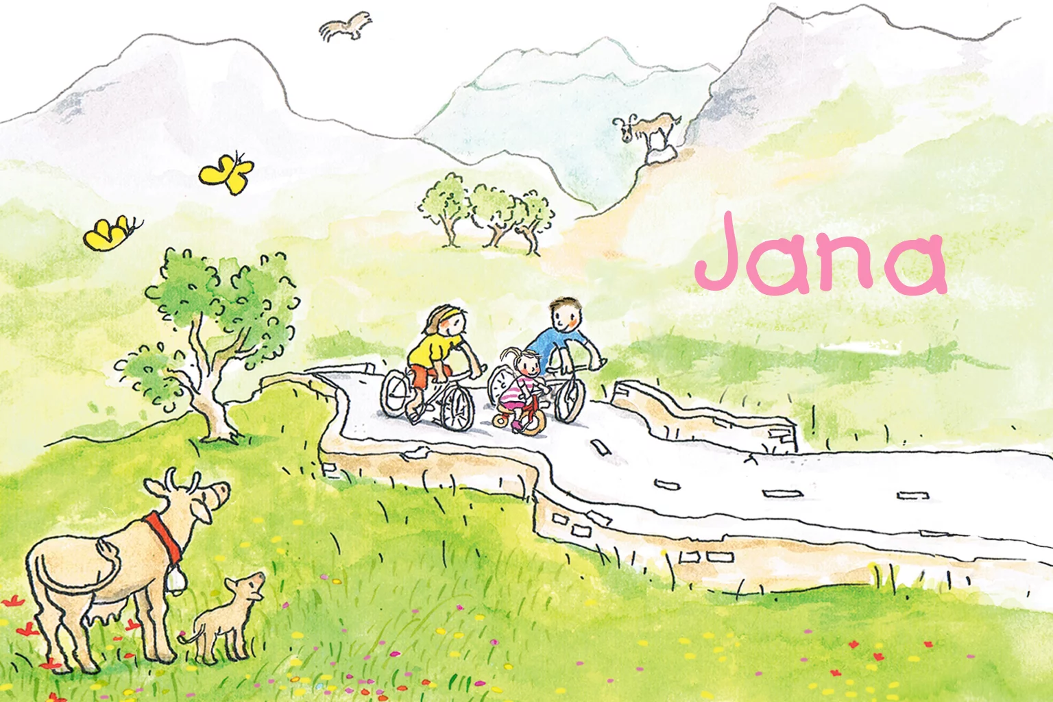 Getekend geboortekaartje voor meisje, sportief fietsen in de bergen. Met dieren en natuur. (21315)