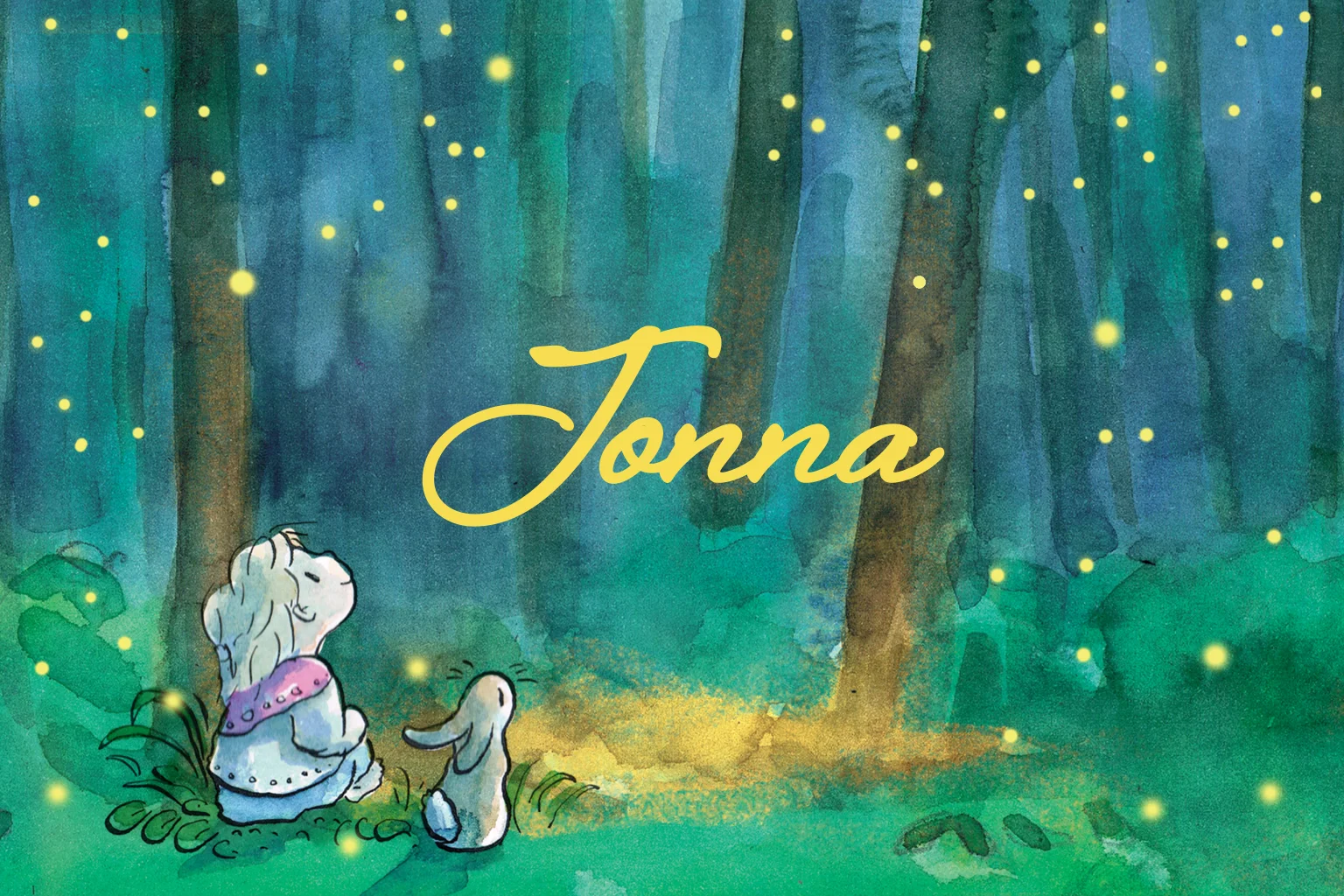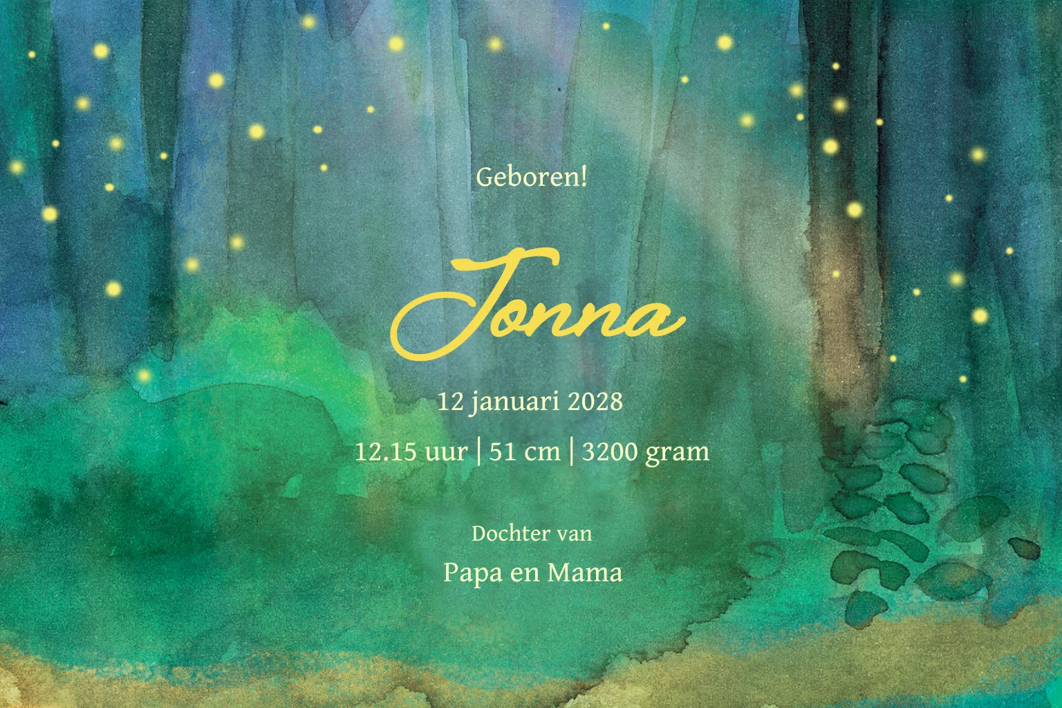 Getekend geboortekaartje voor meisje. Meisje en betoverende vuurvliegjes in bos. Sprookjesachtig en mystiek. (21326)