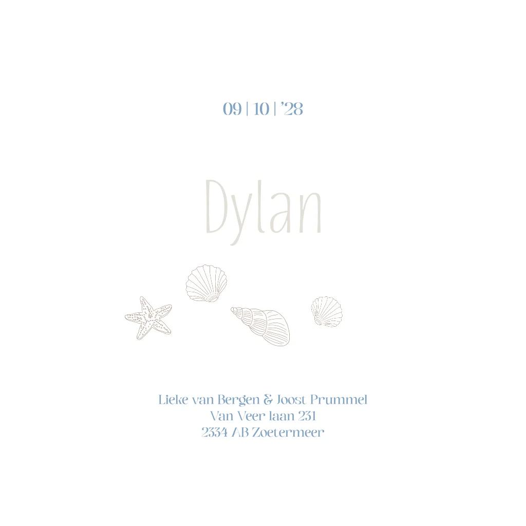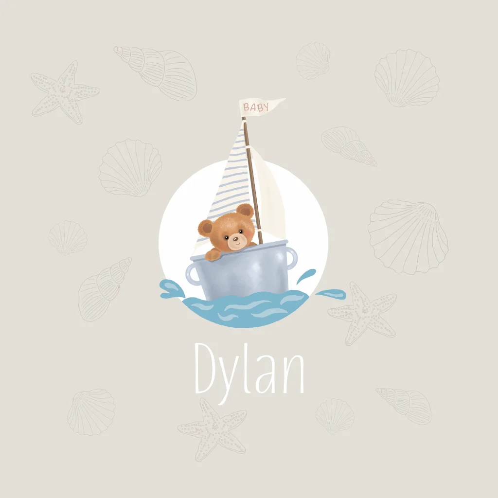 Geboortekaartje zee en strand thema met varend beertje met schelpjes en zeesterretjes