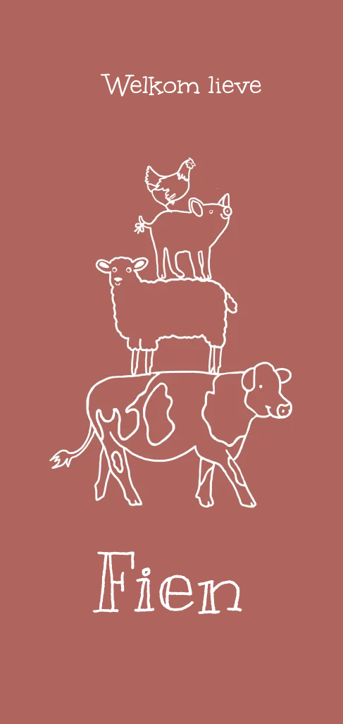 Geboortekaart voor een meisje met boerderijdieren in een toren. Naam in rosegoud (24711)