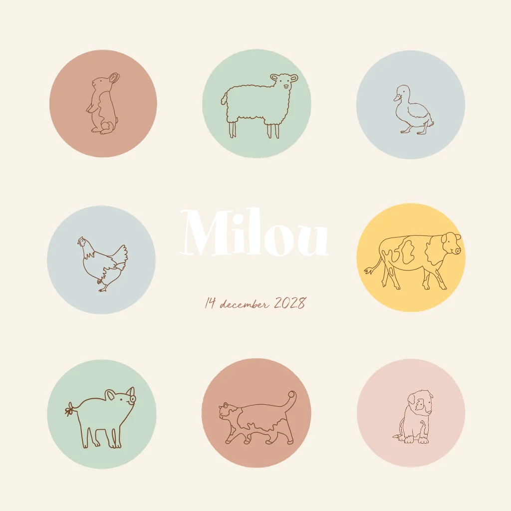 Meisjes geboortekaartje met boerderijdieren getekend in rondjes in vrolijke kleuren. De naam is gedrukt in rosegoud (24752)
