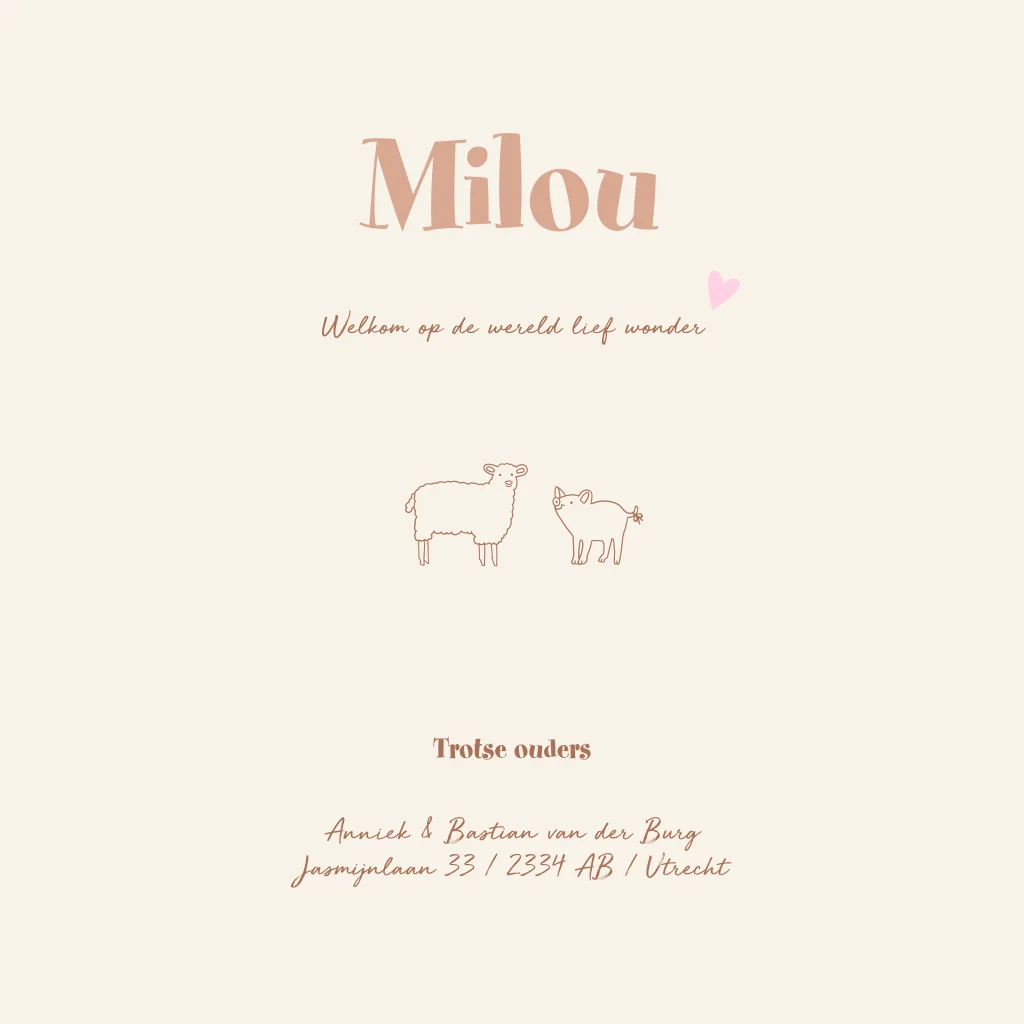 Geboortekaartje met tekeningen boerderijdieren meisje