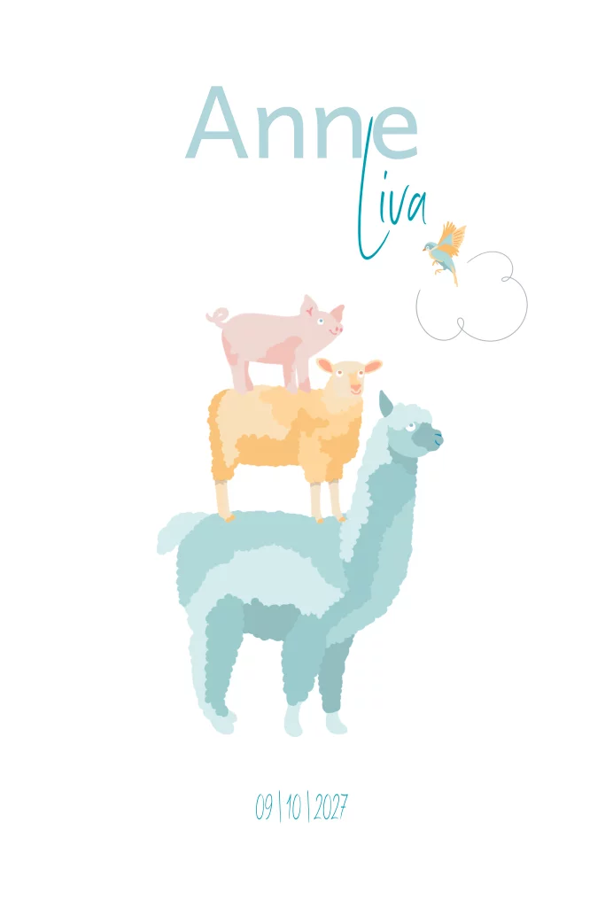 Neutraal geboortekaartje voor een jongen of meisje met vrolijke dieren stapel van een lama, schaapje en een varkentje. (24168)