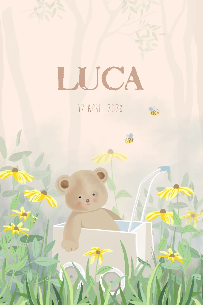 Geboortekaartje voor een jongen in een met beer in wagentje in het bos met bloemen en bijtjes. (24696)