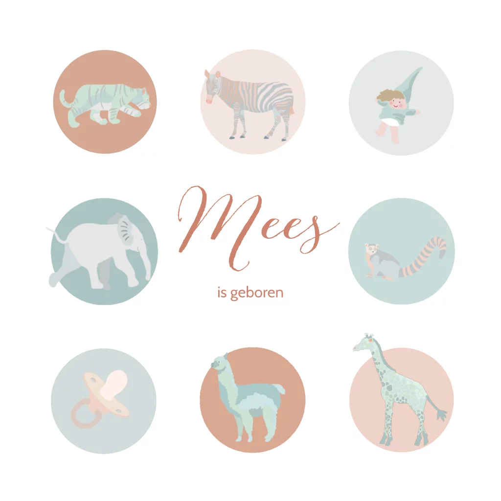 Geboortekaartje voor een jongetje met verschillende dieren in een rondje. (23971)