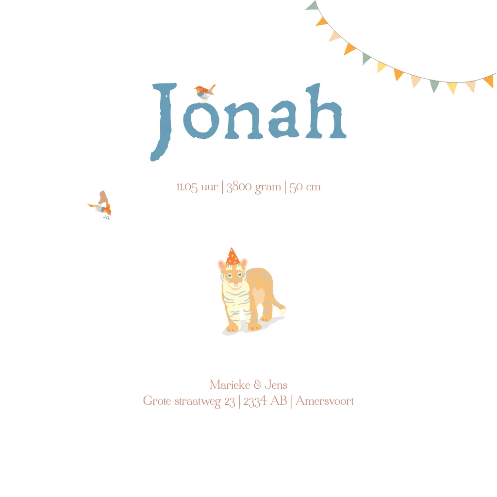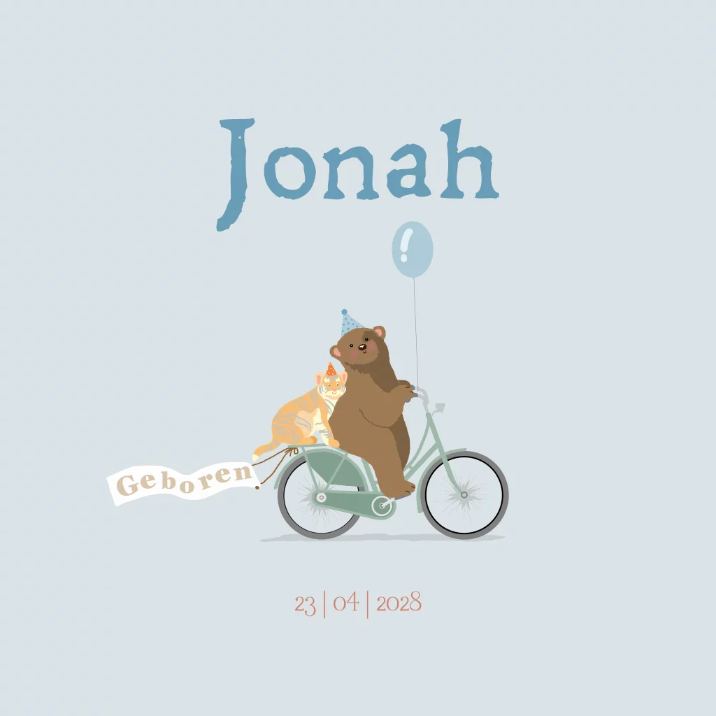 Geboortekaartje jongen op de fiets met beertje en tijgertje