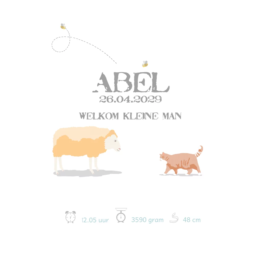 Geboortekaartje jongen met wiegje in de wei met verschillende boerderijdieren. Een schaapje, koe, konijn, kat en bijtjes. (24240)