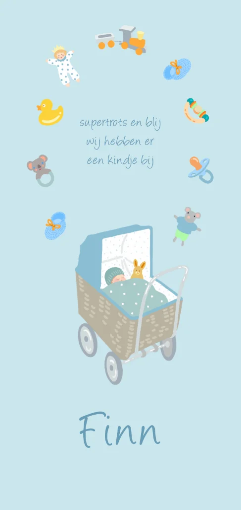 Geboortekaartje jongen met kinderwagen, poppen en speelgoed. (23986)