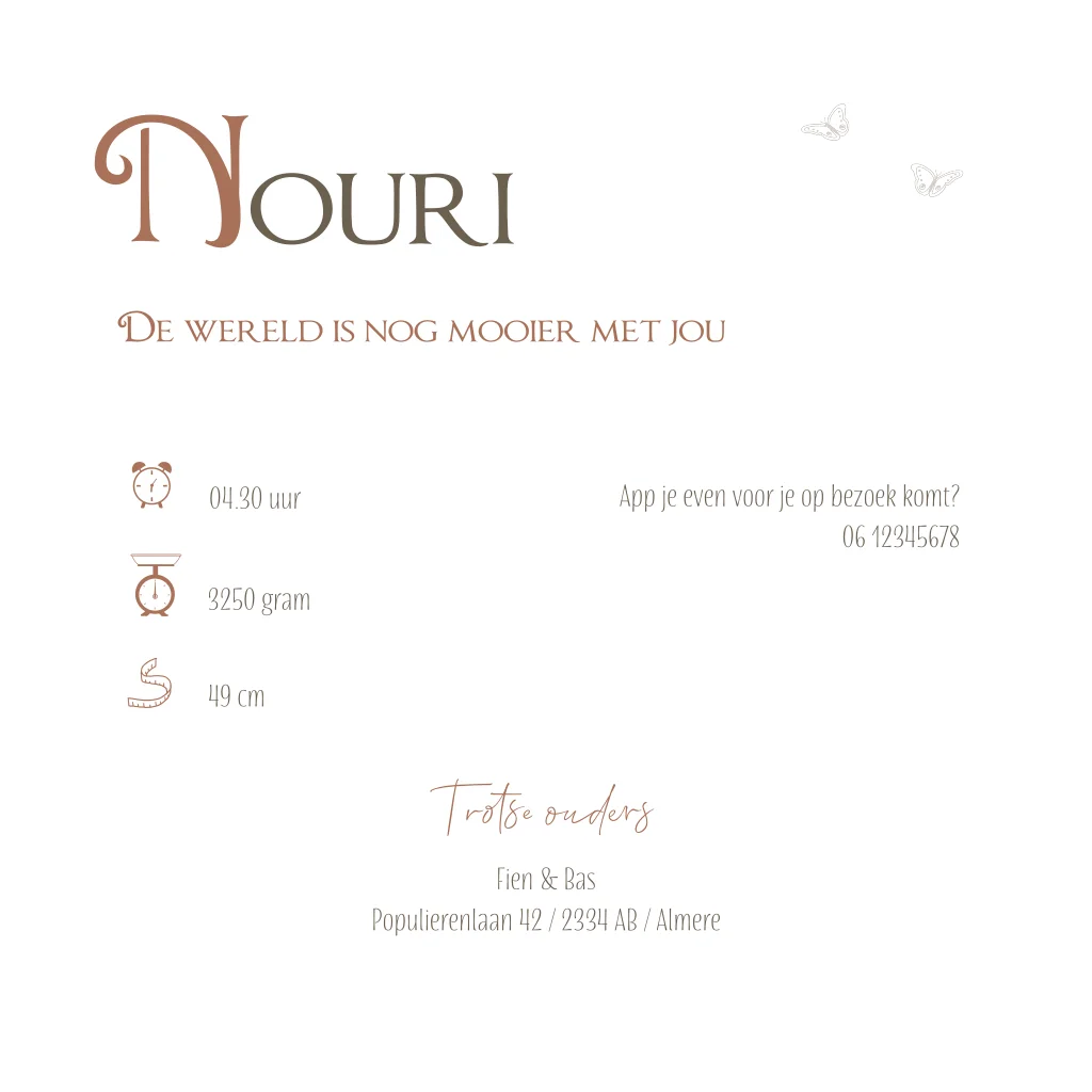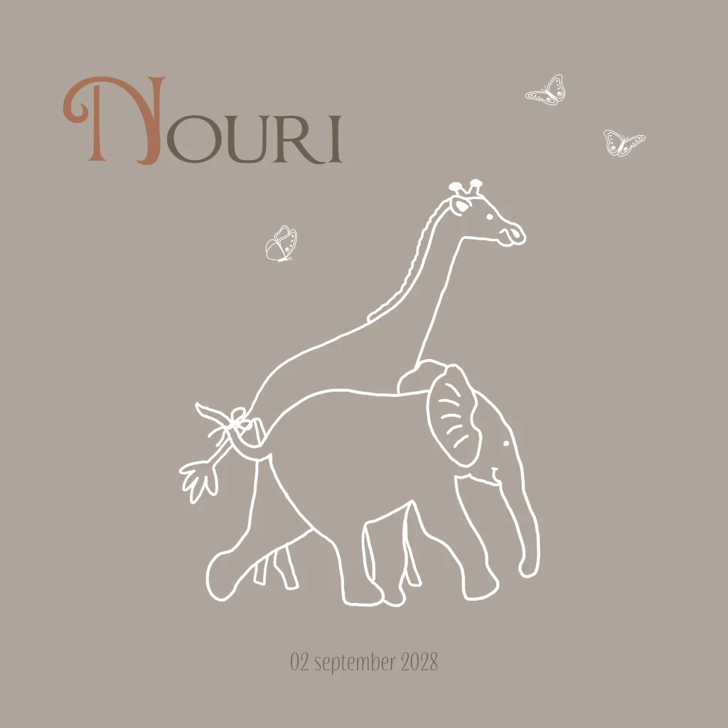 Taupe geboortekaartje Nouri voor een jongen met een lijntekening van een olifant en giraffe en vlindertjes (24713)