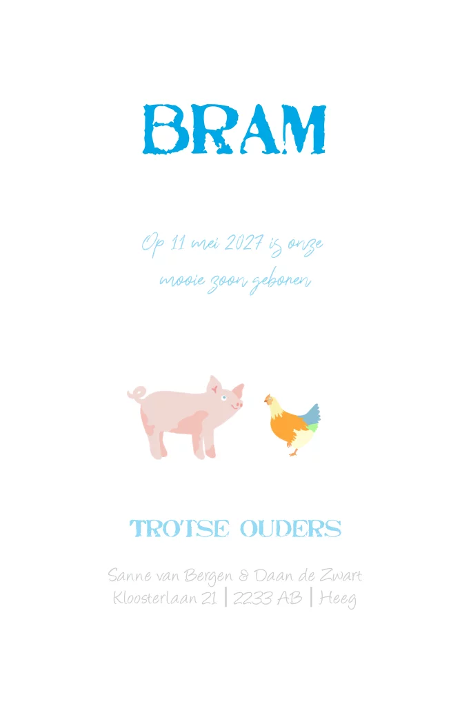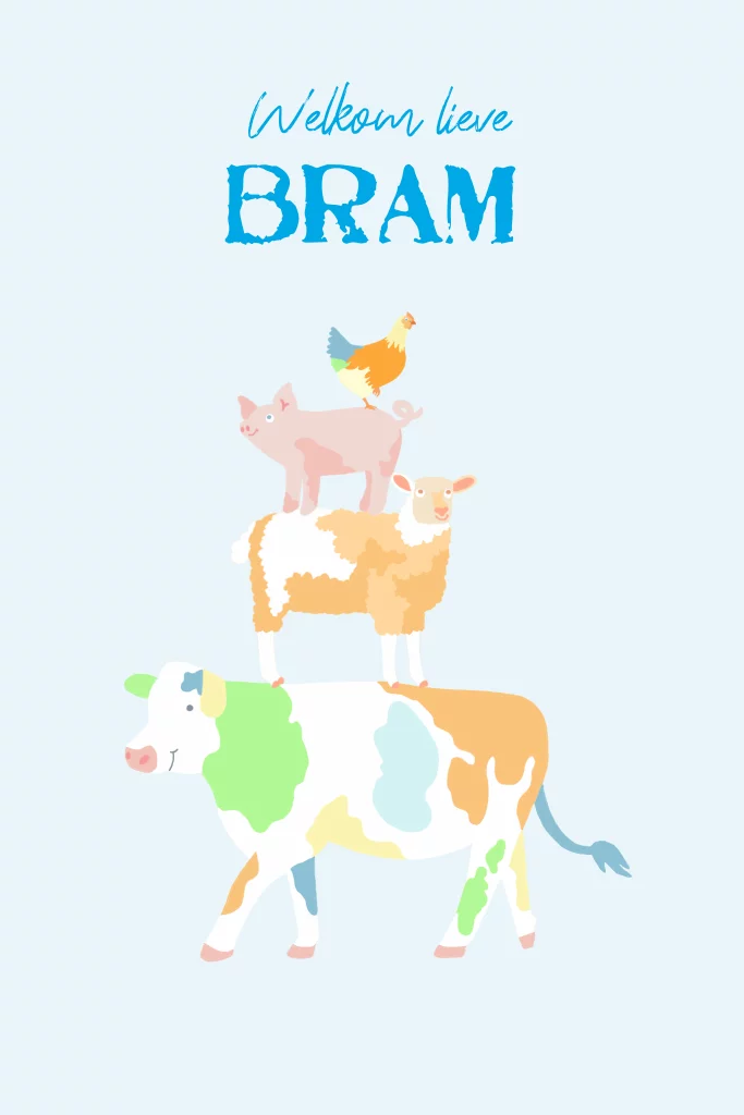 Jongens geboortekaartje met stapel van boerderij diertjes Bram