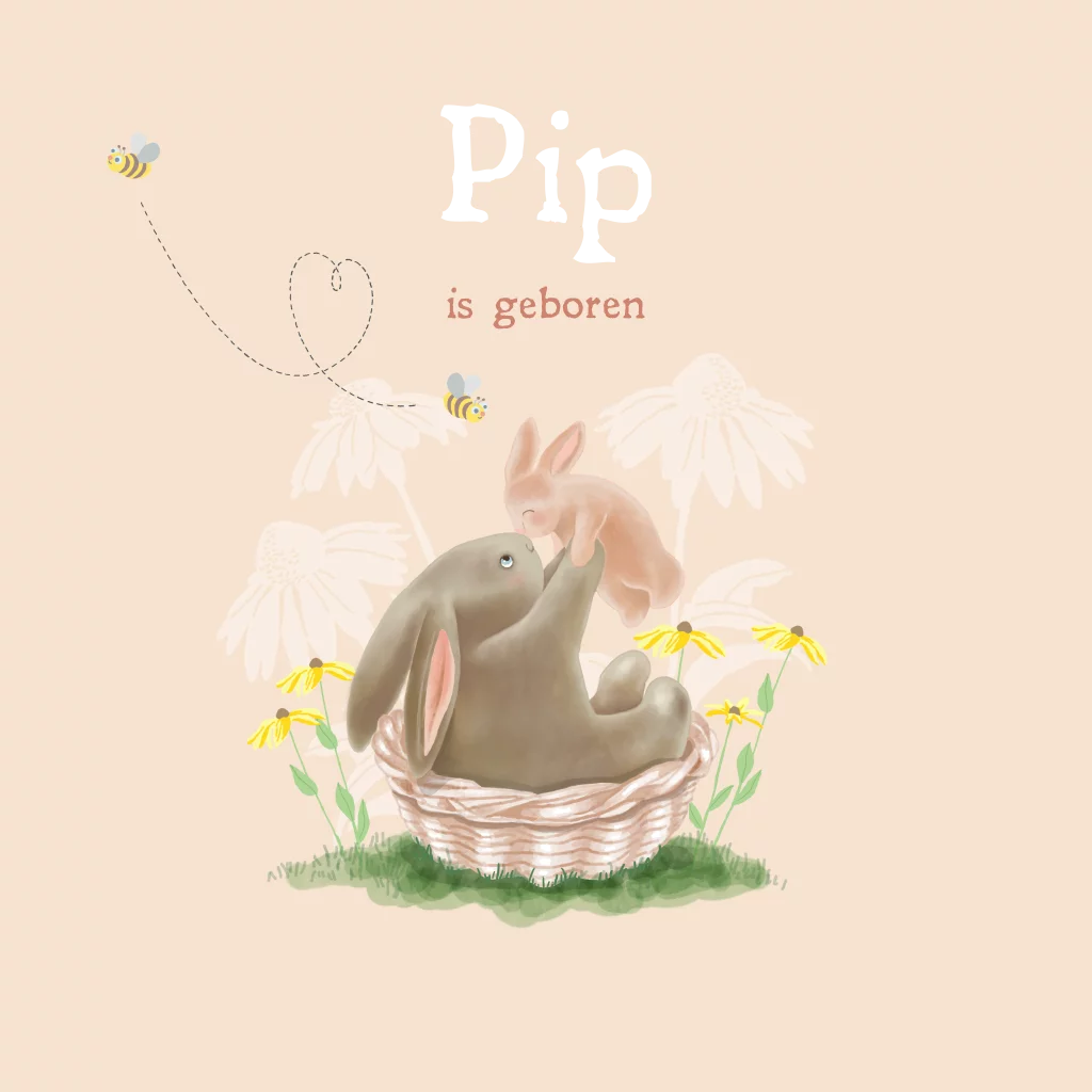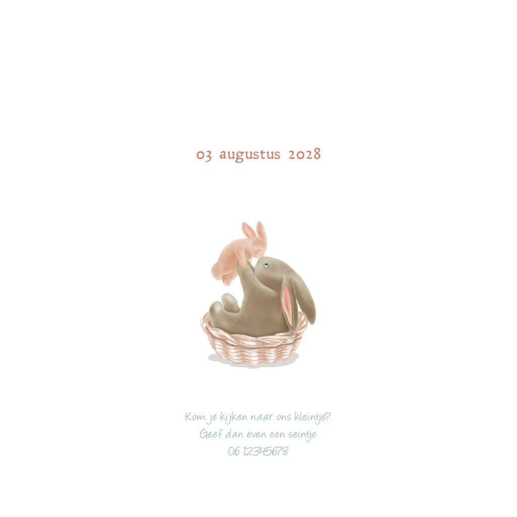 Geboortekaartje meisje konijntje met mama konijn in een mandje met de voornaam in goudfolie