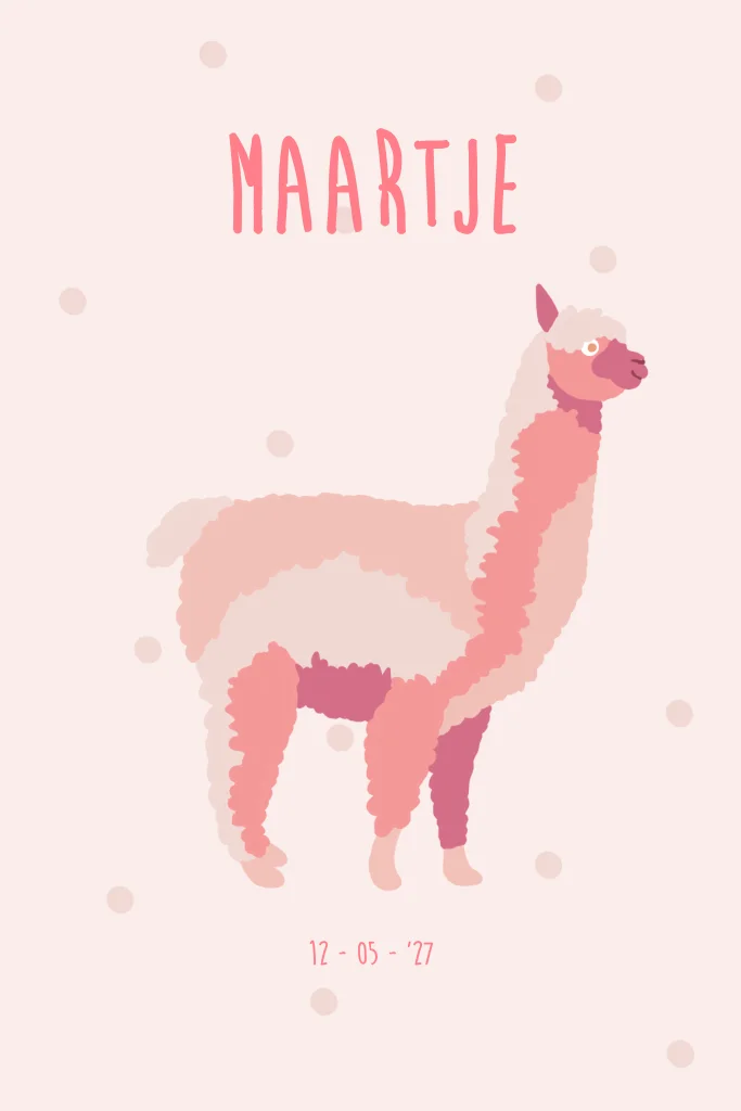 Meisjes geboortekaartje met getekende roze alpaca, lama. (23995)