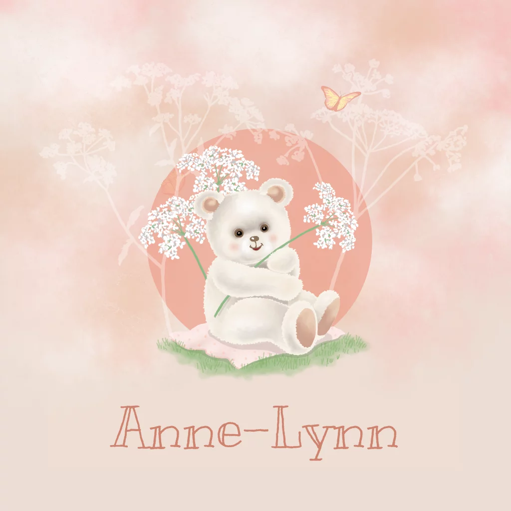 Meisjes geboortekaart met een lief wit beertje, bloemen en vlinders