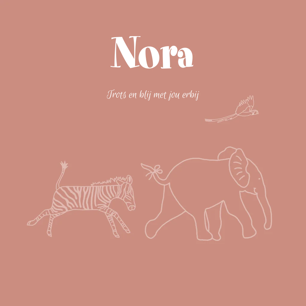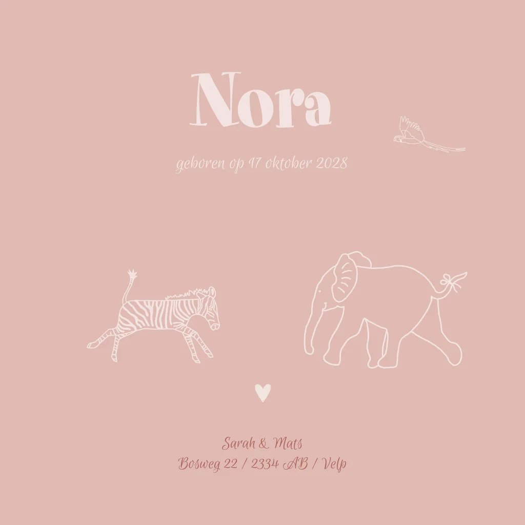 Rosegoud foliedruk geboortekaart meisje met lijntekeningen zebra en olifantje en papagaai (24713)