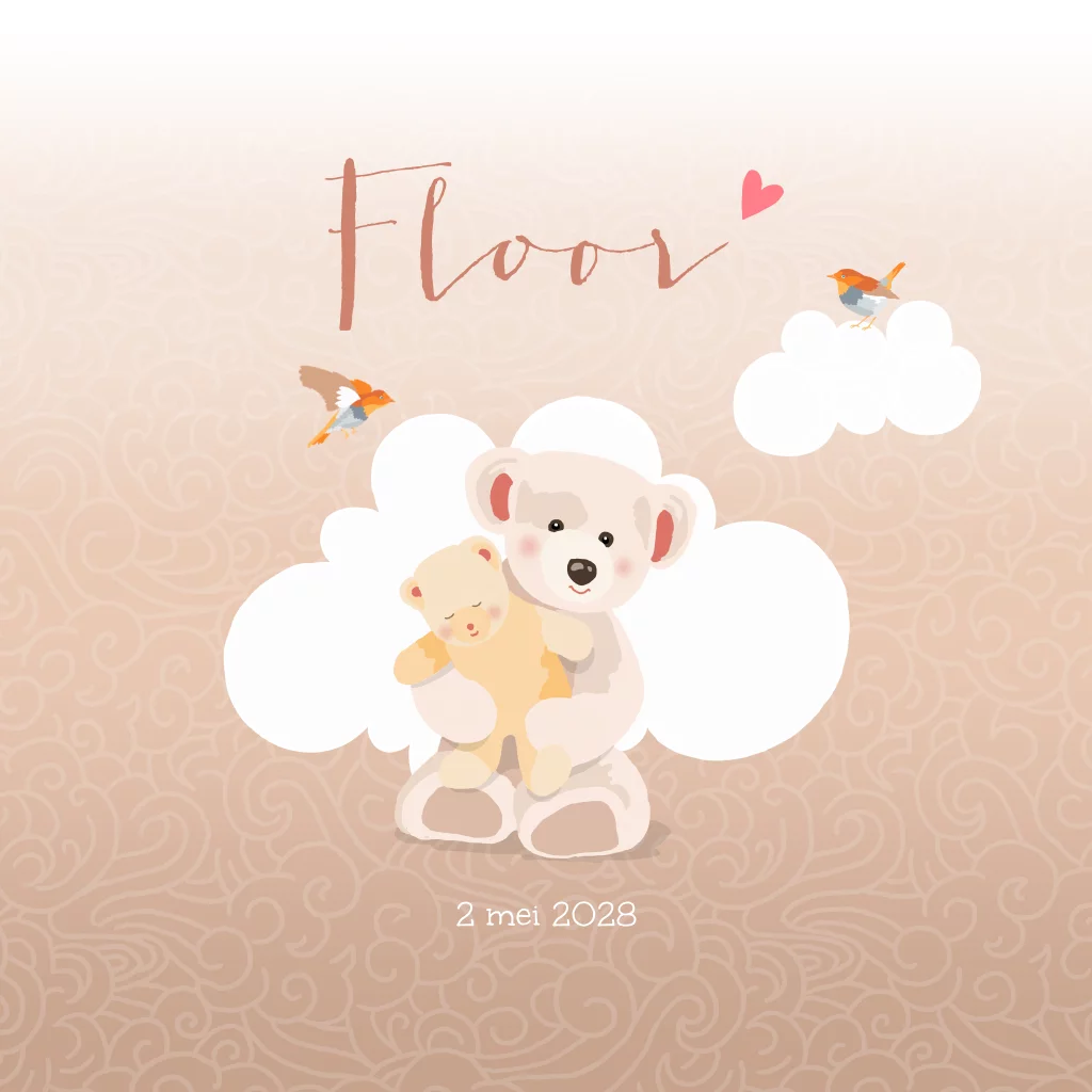 Lief geboortekaartje voor een meisje met beertjes, wolkje en vogeltjes. (24686)