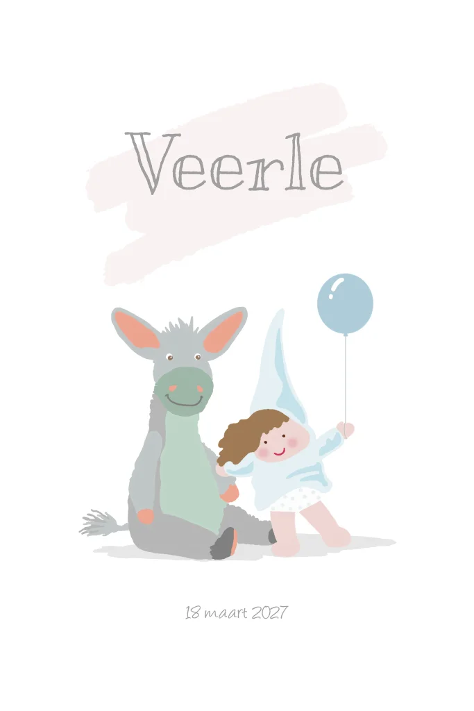 Geboortekaartje voor een meisje met ezel en een pop met ballon. (24395)