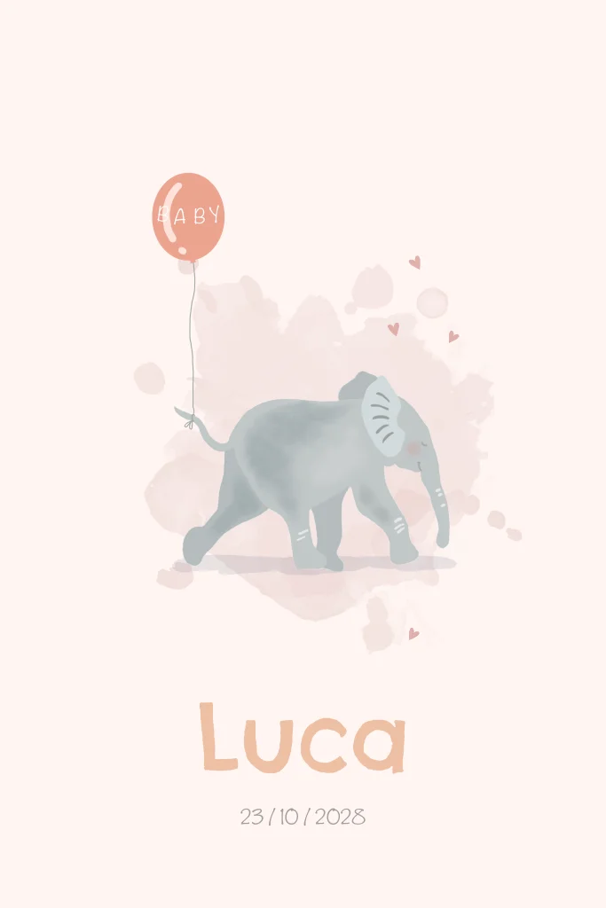 Enkel getekend geboortekaartje voor een meisje met blij olifantje met ballon aan de staart (24710). Deze kaart heeft ronde hoeken, maar kan ook met rechte hoeken ( - 0,30 per kaartje)