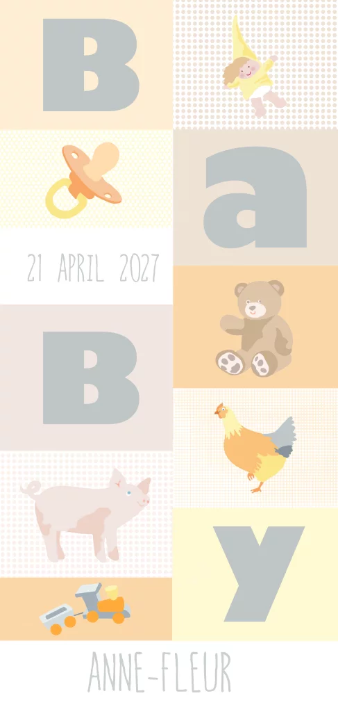 Geboortekaartje voor een meisje met de tekst baby, verschillende vakken met speelgoed en dieren. (24004)