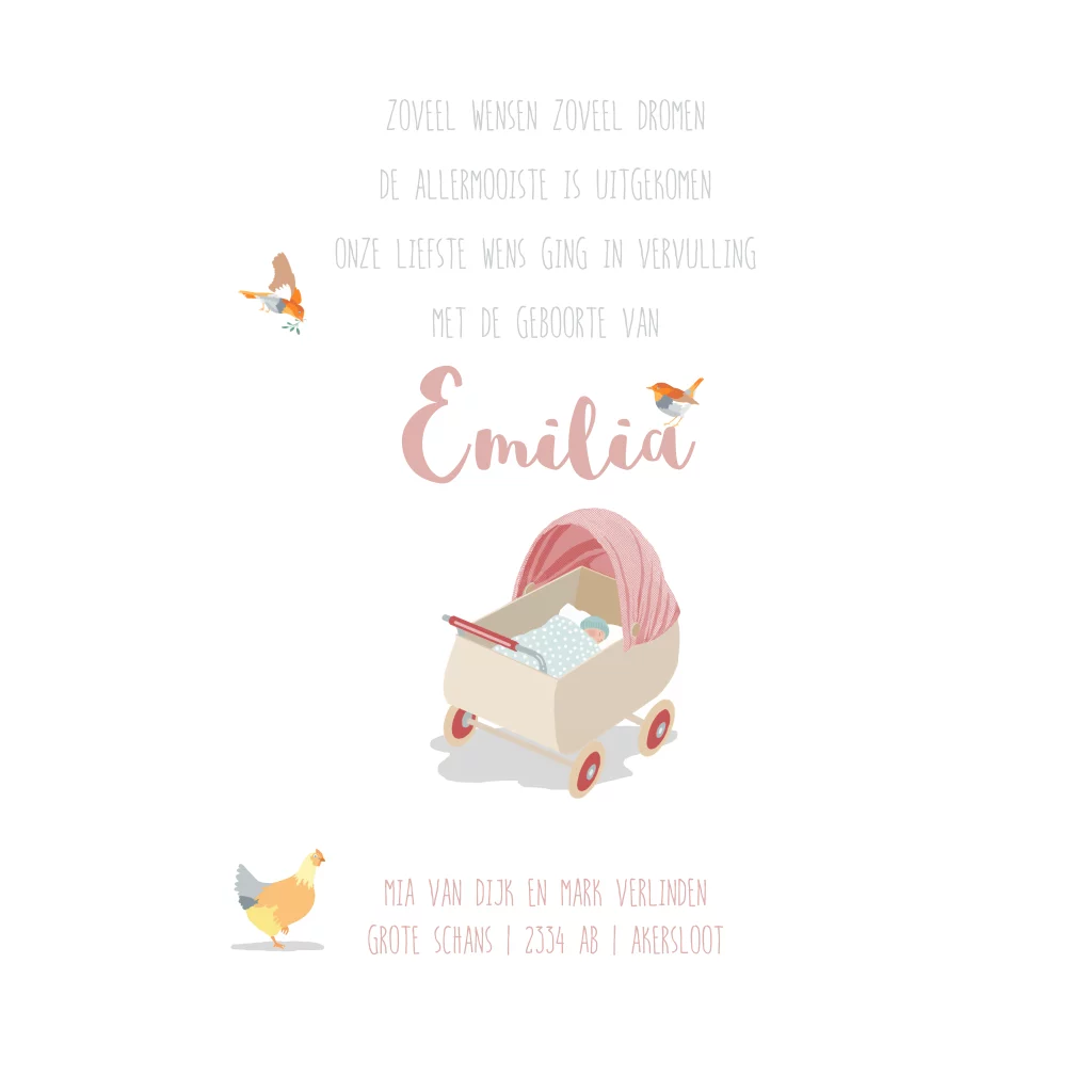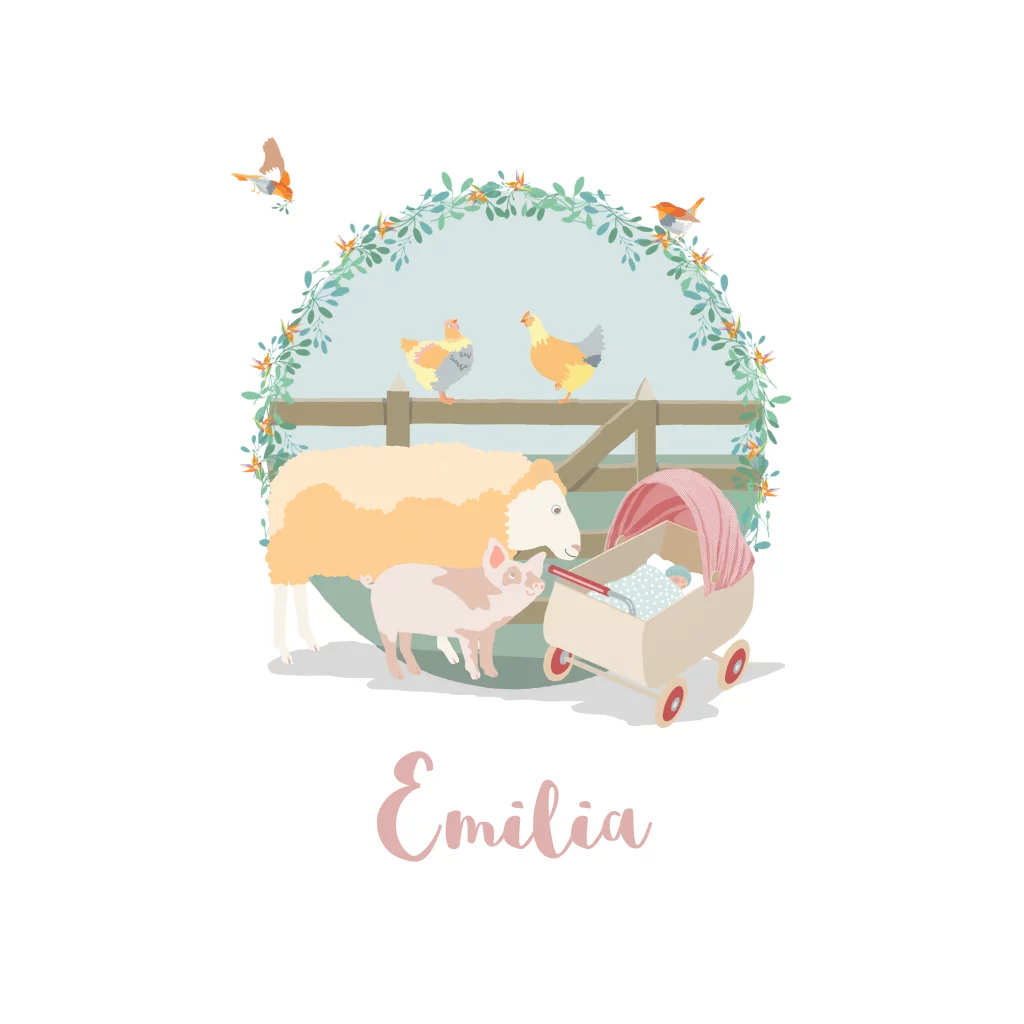 Geboortekaartje voor een meisje met boerderij dieren in de wei met een wiegje, schaap, kippen, biggetje en vogeltjes. (24239)
