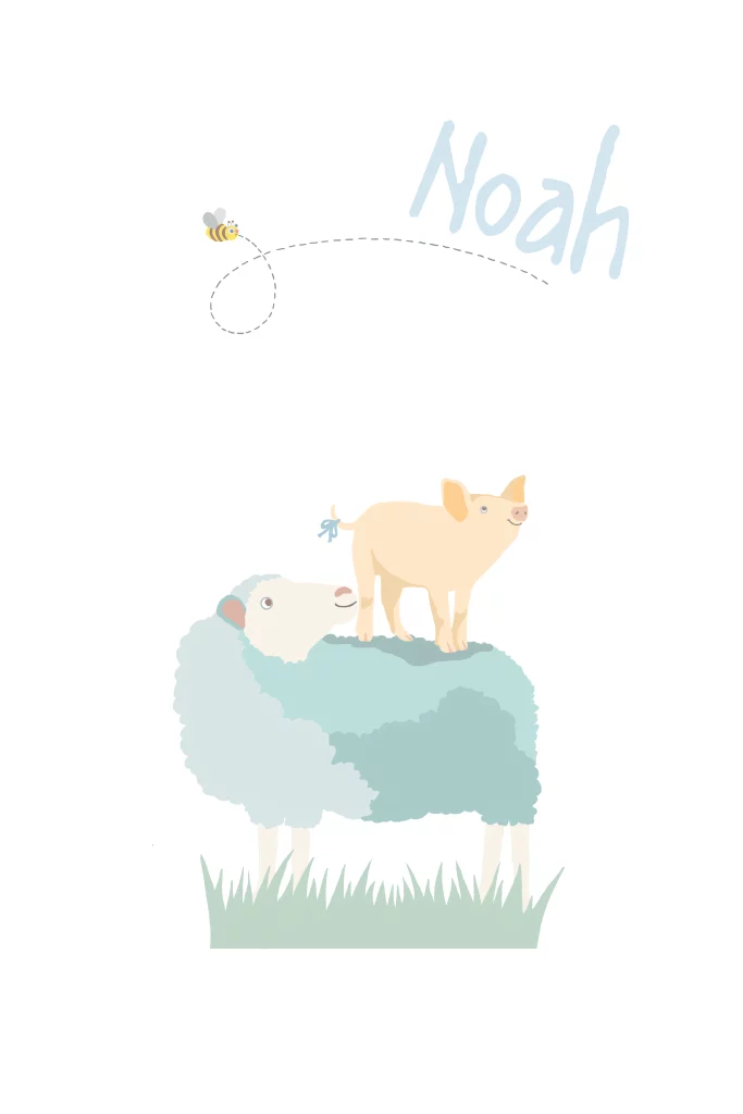 Geboortekaartje schaap voor een jongen of meisje met een biggetje en bijtje. Dieren van de boerderij. (24249)