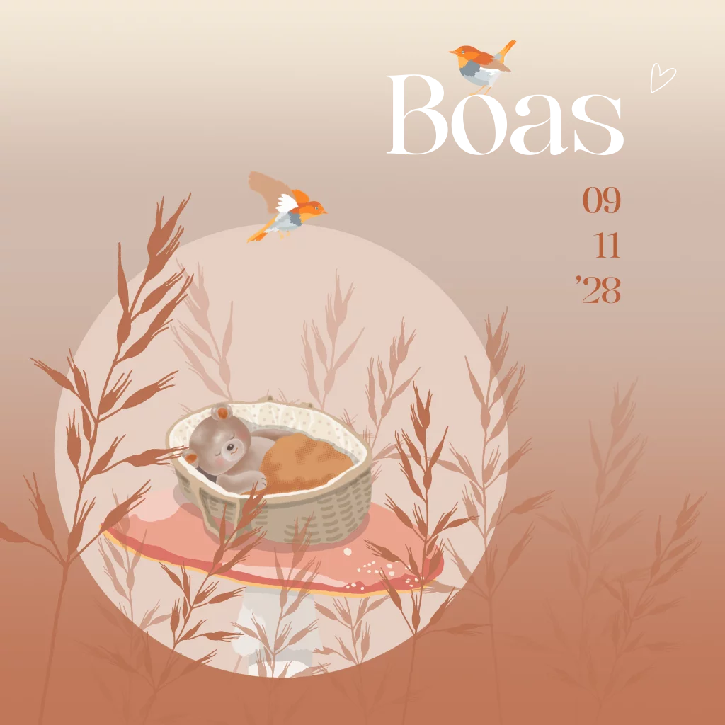 Paddenstoel geboortekaart (naam in rosegoud) met slapend beertje op paddenstoel tussen het koren