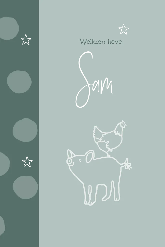 Groen Geboortekaartje Jongen met Boerderijdieren varken en kip op elkaar gestapeld (24732) Goudfolie naam en sterren op voor/achterkant