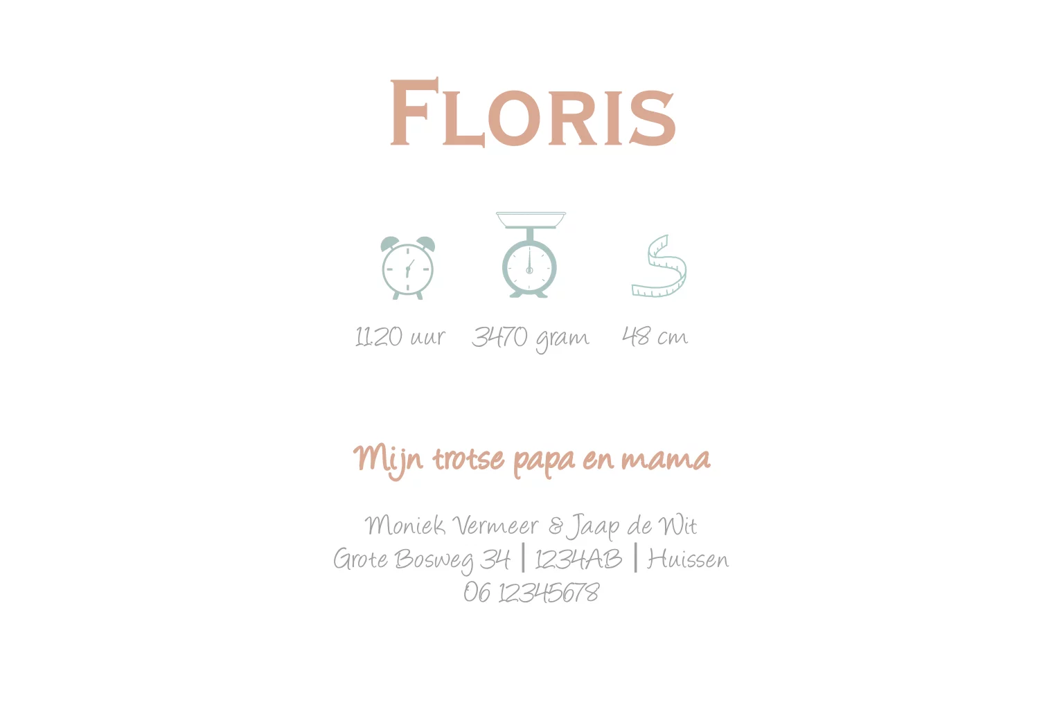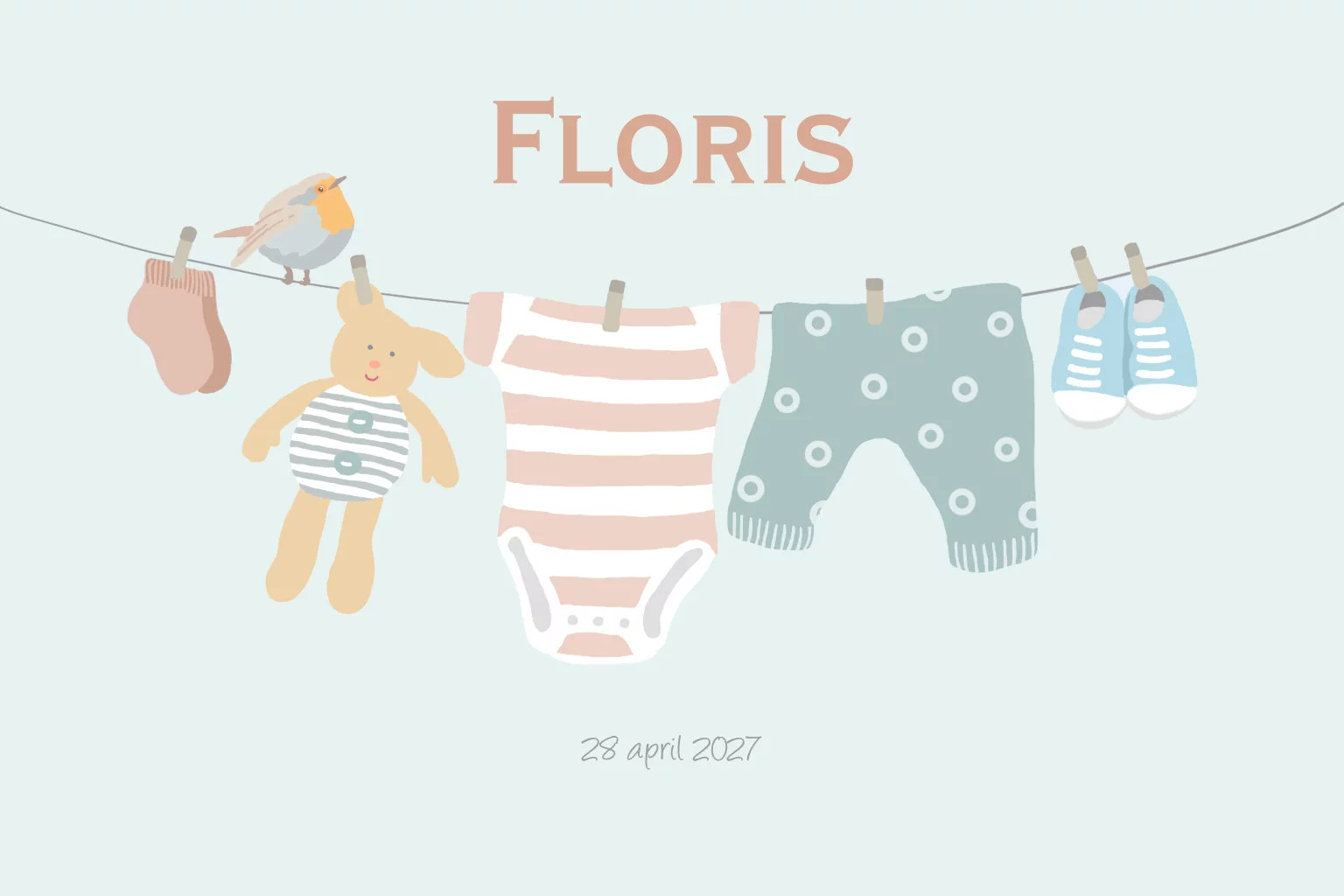 Geboortekaartje voor een jongetje met waslijn vol babykleertjes en een vogeltje. (23970)