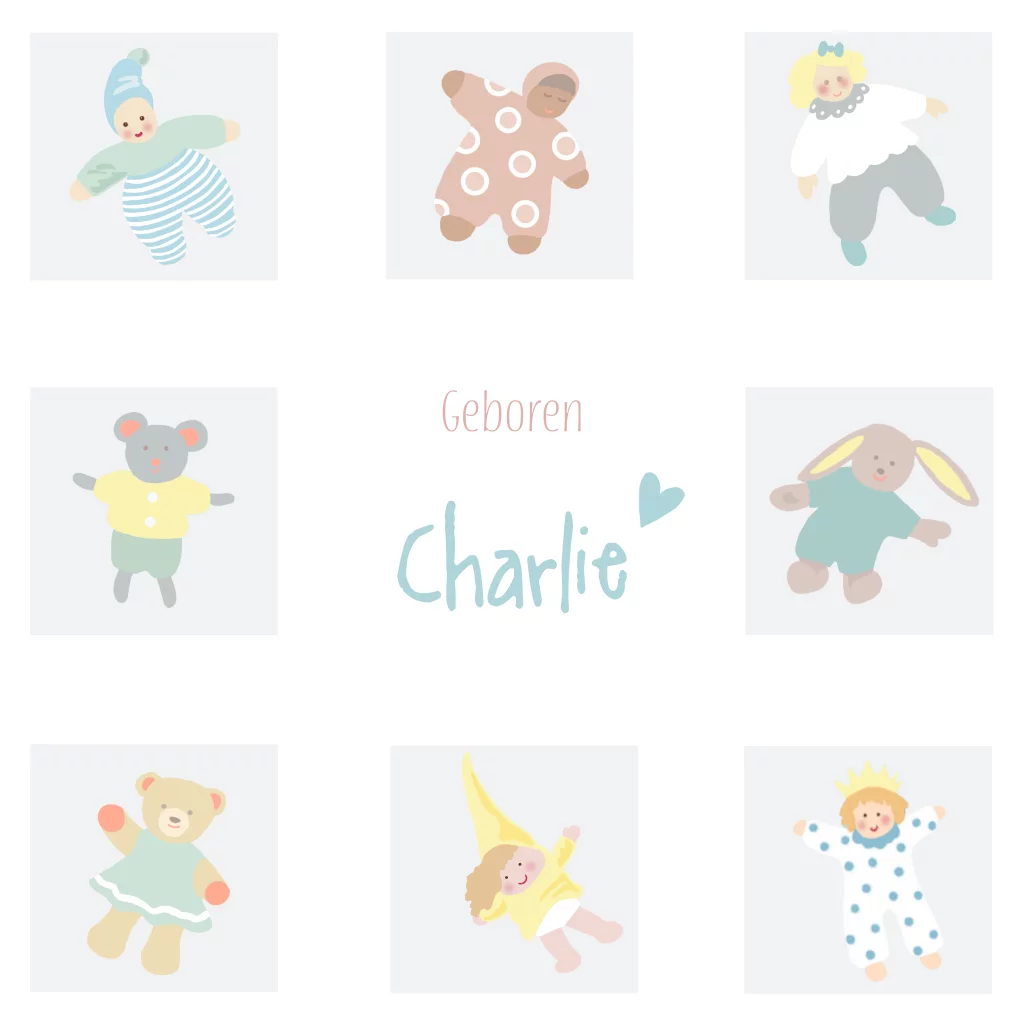 Geboortekaartje voor een jongen of meisje met verschillende lieve getekende dieren knuffels en poppetjes. (24171)