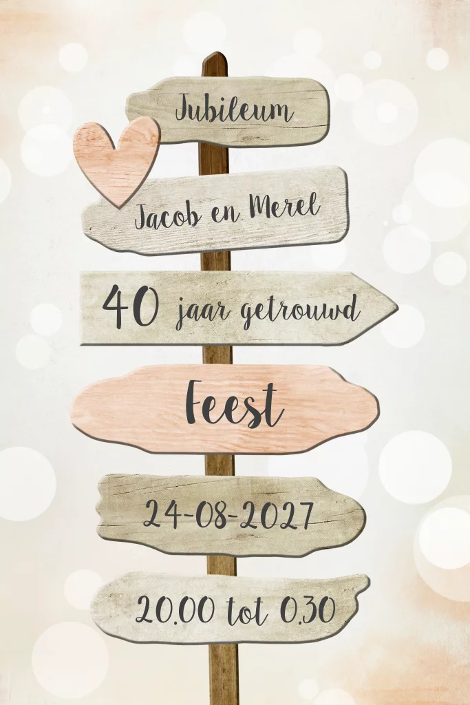 Uitnodiging 40 jaar getrouwd in pastel tinten met een wegwijzer met houten bordjes. Alles teksten zijn aan te passen en binnen kun je een eigen foto plaatsen. (21536)
