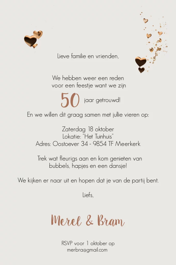 Chique uitnodiging voor 50 jarig jubileum met CHAMPAGNE en goudkleurige HARTJES. Voor een bruisend huwelijksfeest! (24085)
