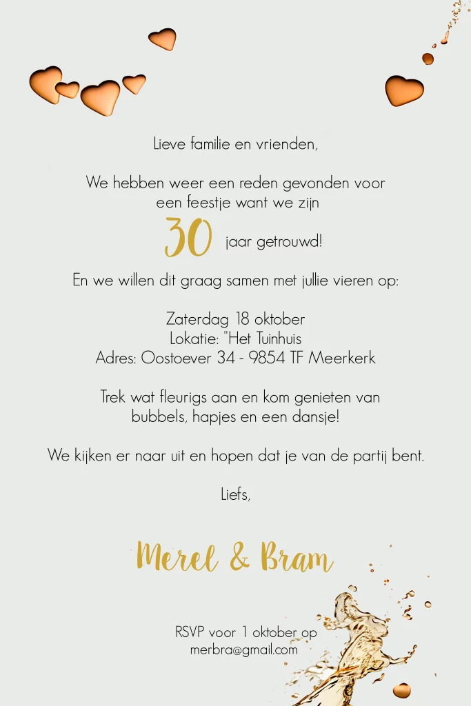 Uitnodiging 30 jaar getrouwd met champagne voor jubileum feest.